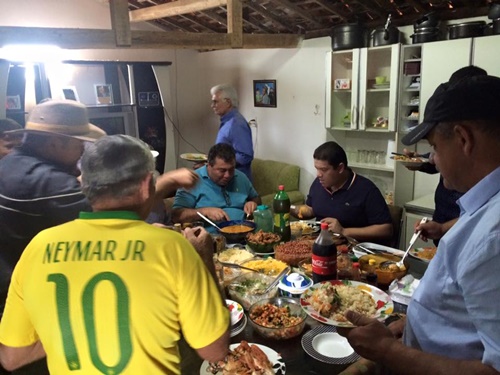 | Eita, será que estava uma aposta entre o vice-prefeito, Arnóbio, com o secretário de governo, Alisson, para saber quem come mais? Essa turma boa não deixa de atender um convite para estar na zona rural. |