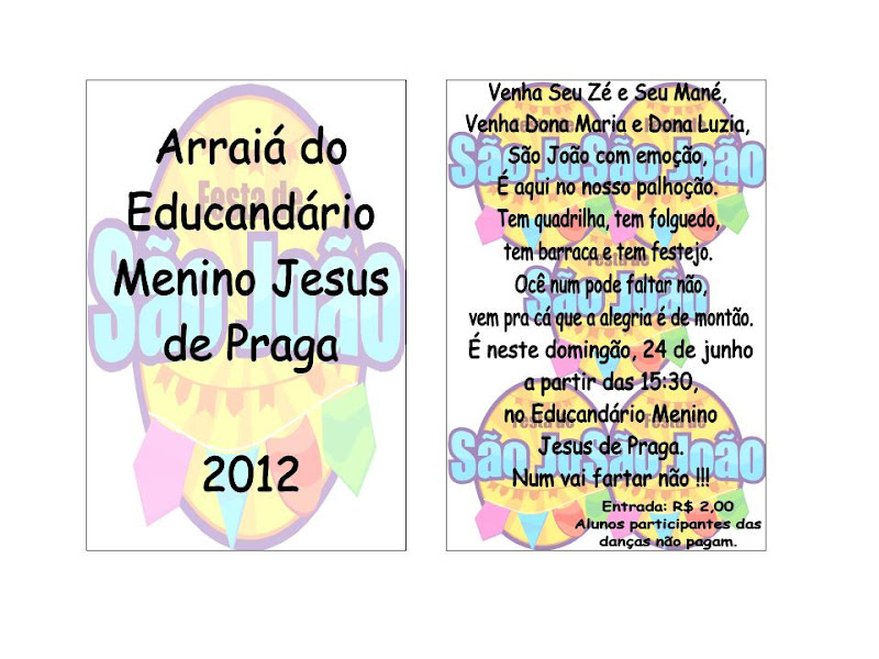 O Educandário Menino Jesus de Praga, realiza no próximo domingo, 24/06, um grandioso arraiá junino, comemorando a chegada de uma das maiores festas do ano, São João. O evento será aberto ao público, com inicio marcada para às 15:30h. Todos os bonconselhenses estão convidados à participar.