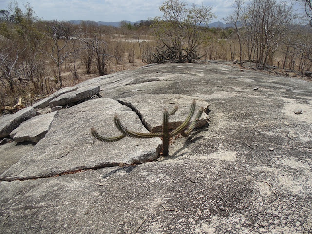 Tem como o gado sobreviver num lugar assim? Até as vassourinhas estão morrendo por falta d'água. Espera-se que nessa região, agora em novembro, período de trovoadas, volte a chover e da uma nova vida a vegetação da caatinga. Quando fiz essa foto, andando pelo cercado rumo a pedra e caverna do Hipopótamo, os desafios foram a pouca ventilação, sol escaldante e inalação do pó que sai da folhagem seca, além do solo quente. Mas, escapamos...