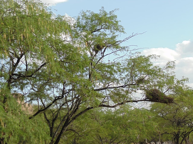 A engenharia do ninho do casaca-de-couro impressiona a todos. Esse pássaro é uma ave passeriforme da família Furnariidae. Com sua penugem amarelada e um bico que mais parece uma tesoura, sabe direitinho costurar com galhos secos e folhas, seu próprio habitat. Na fazenda onde fica a caverna e pedra do Hipopótamo, encontrei vários ninhos do casaca-de-couro em cima das algarobeiras, que mesmo com altas temperaturas resistem a seca, pois, sua raiz vai fundo buscar água no lençol freático da região.