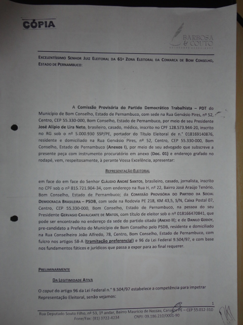 É bom lembrar que blogueiro nenhum é obrigado a divulgar agenda de candidato, nem tão pouco, santinhos eleitorais, etc. Não existe lei com esta obrigação. Mas, voltando a REPRESENTAÇÃO ELEITORAL, contra o blogueiro Cláudio André O Poeta, o candidato a prefeito pelo PSDB, Danilo Godoy e o presidente do referido partido, Gervásio Matos, o setor juridico compostos de três excelentes advogados, Daniel Filho, Márcia Matos, que dignificam o nome da advocacia pernambucana, já entregam a defesa em tempo hábil, resta apenas aguardar da decisão judicial. No demais, continuaremos firmes e fortes e na certeza que Bom Conselho terá um novo rumo a partir de 2013. Como escreveu Aristóteles, "A coragem é a primeira das qualidades humanas porque garante todas as outras", assim continuaremos sempre confiante em Deus e tra-ba-lhan-do!