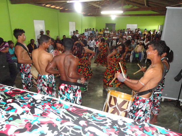 | PARA RECEPCIONAR OS CONVIDADOS, O GRUPO DE DANÇA QUILOMBOLA SE APRESENTOU COM UMA DANÇA FOLCLÓRICA. |