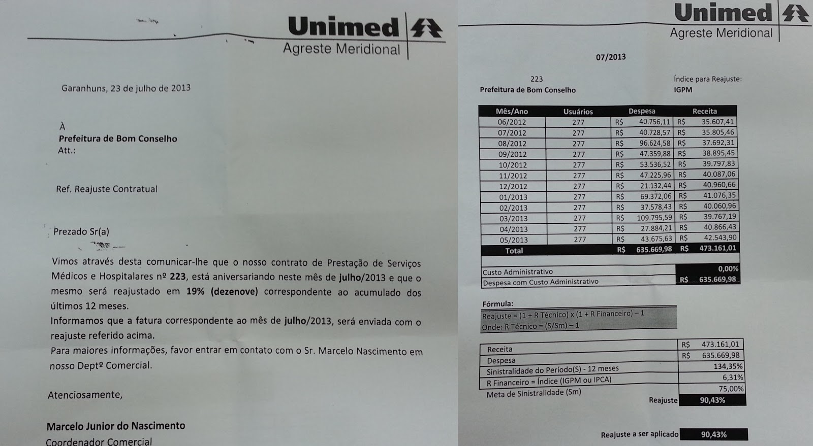 Na foto acima, o comunicado do reajuste e a tabela de receitas e despesas da UNIMED com os servidores da Prefeitura de Bom Conselho, que serviu de base para o reajuste aplicado.
