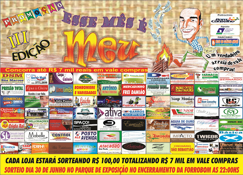 E continua o sucesso do momento. É a promoção ESSE MÊS É MEU, do publicitário Ulisses Mendonça, que se estenderá até o próximo dia 30. Mais de 70 lojas participando, mais de 7 mil reais em prêmios serão sorteados. Essa é uma promoção que já nasceu grandiosa, eis o motivo de tanta aceitação comercial e popular. Continue comprando no comércio local, peça seu cupom, preencha, deposite nas urnas e torça para ser o próximo ganhador (a).