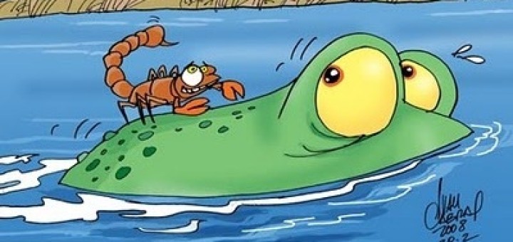O sapo concorda e começa a carregar o escorpião, mas no meio do caminho, o escorpião, de fato, ferroa o sapo, condenando ambos.