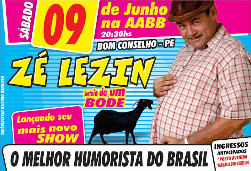 TUDO PRONTO PARA O SHOW DO RISO EM BOM CONSELHO. ZÉ LEZIN, MAIS UMA VEZ ESTARÁ EM BOM CONSELHO E DESTA FEITA COM UM NOVO SHOW. OS INGRESSOS ESTÃO SENDO VENTIDOS, NO POSTO AVENIDA, COM GERÔNIMO VIZINHO A LOTÉRICA, NA CASA DO PLOCK PRODUÇÕES E EVENTOS E NO CARRO DE SOM QUE ESTÁ GIRANDO PELAS RUAS DE BOM CONSELHO.