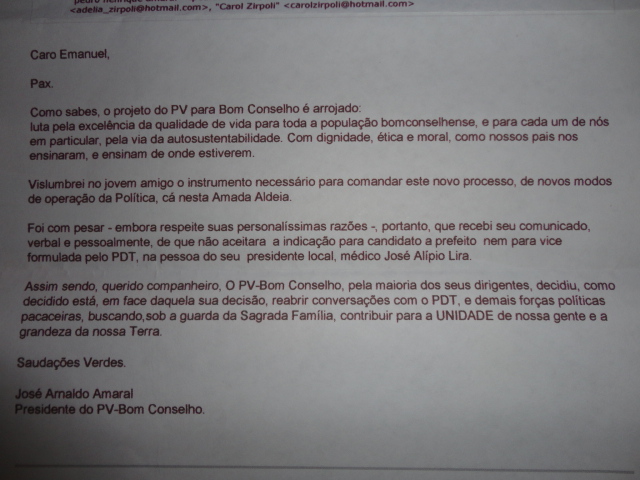 Recebemos das mãos do presidente Partido Verde de Bom Conselho, advogado José Arnaldo Amaral, uma correspondência (cópia de um e-mail), onde o engenheiro Emanuel Luna, não aceitou o convite para ser o candidato a prefeito ou vice do PDT da terra de Papacaça. Leia-se na integra o que diz a missiva acima.