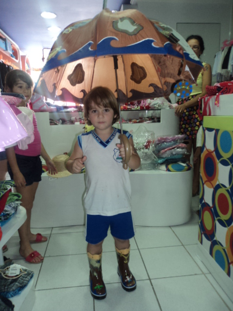 | Gabriel com seu guarda - chuva e botas pirata. |