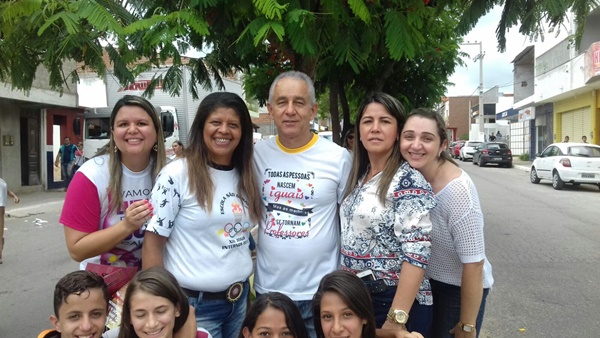 | A secretária de educação, Cibele Cavalcante, acompanhada dos professores, José Merêncio e Dênia Marinho, além de funcionários da secretária de educação, estiveram participando da Caminhada de Combate ao Mosquito da Dengue, nessa manhã de quinta-feira, 18/02. |