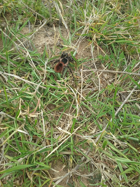 Enquanto fazia fotos e filmagens, passou sobre os pés desse blogueiro essa caranguejeira. Segundo o que pesquisei, as tarântulas são inofensivas para os seres humanos (mas a picada dói muito), e seu veneno é mais fraco do que uma picada de abelha comum.