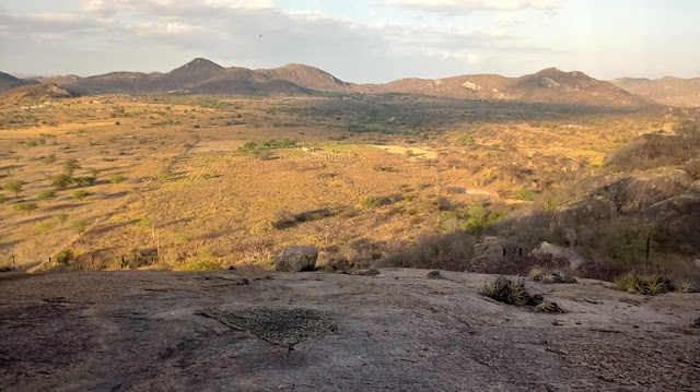 Veja ai a minha vista privilegiada enquanto estava dentro da caverna e pedra do Hipopótamo. A vegetação mudou do verde para o cinza. As árvores que ainda resistem com o verde são as algarobeiras e juazeiros.