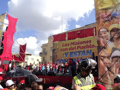 Comecei o sábado na Praça Venezuela (ao contrário do que aparenta, não é propriamente uma praça, e sim uma área da cidade, como se fosse um bairro). Aí, como se vê na foto acima (de Gregorio Terán/AVN), se concentraram milhares de integrantes/beneficiários das chamadas “misiones” – são as missões, através das quais a denominada revolução bolivariana (ou o governo de Chávez) executa os programas sociais (voltarei em outra postagem ao assunto).