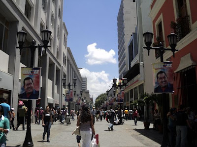 Dei uma esticada até a Praça O Venezuelano, passando por esta rua aí acima coalhada de gente e cartazes de Chávez. Nesta praça no final da tarde, nos fins de semana, costumam “bailar” casais cinquentões/sessentões, mas era ainda por volta do meio-dia, o serviço de som soltava ao ar canções românticas: quando passei estava tocando, em espanhol, claro, “Maria Helena es tu, a minha inspiração…” (acho que é assim, não? No Brasil era cantada por Altemar Dutra, estou certo?).