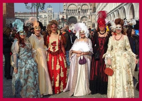 As socialites venezianas, mantendo a tradição do século XVIII, onde a nobreza se disfarçava para sair e misturar-se com o povão nas ruas.