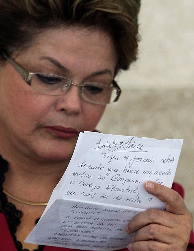 “Por que os jornais estão dizendo que houve um acordo ontem no Congresso sobre o Código Florestal? Eu não sei de nada?”, questionou Dilma em seu bilhete, o que foi registrado magistralmente em foto de autoria de Beto Barata.