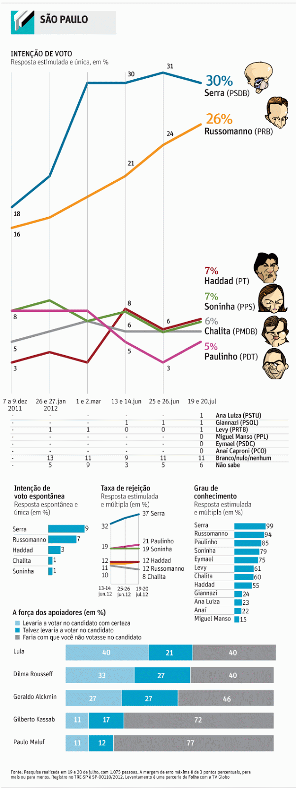 Celso Russomano, por sua vez, poderá ter grande dificuldade em manter o alto índice de intenção de voto que o Datafolha. Ainda que conte com uma parcela importante do eleitorado evangélico, que lhe deverá ser fiel ao longo da campanha, Russomano foi impedido, por conta da legislação eleitoral, de manter seu programa de televisão numa emissora bastante popular, o que certamente constituiu-se, nos últimos meses, num diferencial em relação a todos os demais candidatos até aqui. Mas mais do que isso, Russomano contará com menos de 1/3 do tempo de TV na propaganda eleitoral que Serra e Haddad, e também com menos tempo que Gabriel Chalita (PMDB), seus principais concorrentes. Sabendo-se que em grande medida eleições hoje no Brasil são decididas não apenas nas ruas ou nos debates, mas também no horário eleitoral, a campanha de Russomano terá de cortar um dobrado para não ver parte das atuais intenções de voto migrarem para outros candidatos.