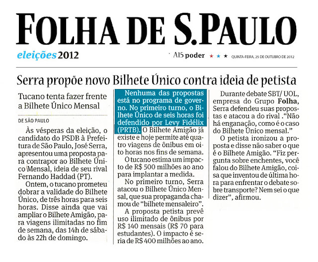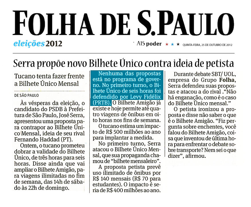 Conceição LemesBilhete Único de 6 horas é ideia de Levy Fidelix. O resto é cópia.