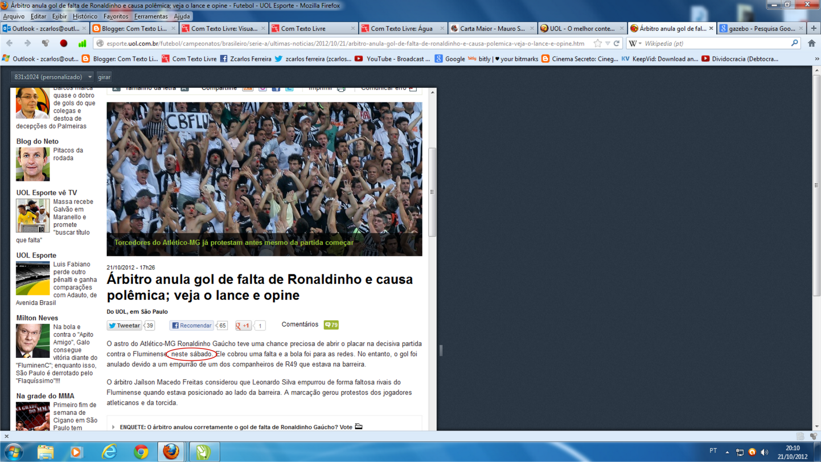 October 20, 2012 21:00 - no comments yetPara quem pensava que estava assistindo ao vivo o jogo Atlético Mineiro e Fluminense, o UOL esportes informa que o jogo foi ontem!