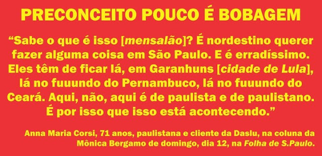Carolina Pires de Campos incentiva a amiga a continuar: “E o que é o ‘mensalão’, Anna?”. “Sabe o que é isso? É nordestino querer fazer alguma coisa em São Paulo”, responde Anna. “E é erradíssimo. Eles têm de ficar lá, em Garanhuns [cidade de Lula], lá no fuuundo do Pernambuco, lá no fuuundo do Ceará. Aqui, não, aqui é de paulista e de paulistano. É por isso que isso está acontecendo”.