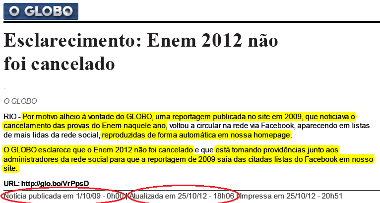Às vésperas das eleições, quando o candidato tucano José Serra está atacando seu oponente Haddad, o perfil no facebook do jornal "O Globo" ajudou a espalhar um boato falso sobre cancelamento da prova do ENEM 2012, ressuscitando uma notícia antiga de 2009 como se fosse atual.