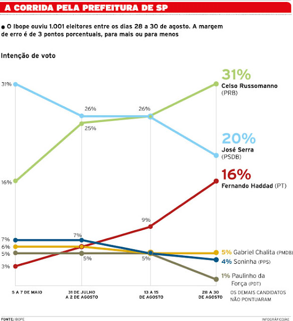 O candidato do Partido dos Trabalhadores – partido que a mídia e seus bate-paus na internet querem colocar na ilegalidade – a prefeito de São Paulo, Fernando Haddad, acaba de empatar tecnicamente com José Serra, que a direita esperava que fosse o grande beneficiado pelo julgamento do mensalão.