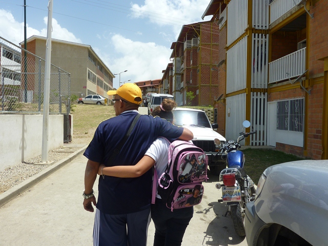| Carlos Marques abraça a filha conforme caminha até o centro comercial de Ciudad Caribia |