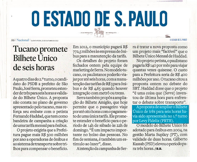 Conceição LemesBilhete Único de 6 horas é ideia de Levy Fidelix. O resto é cópia.