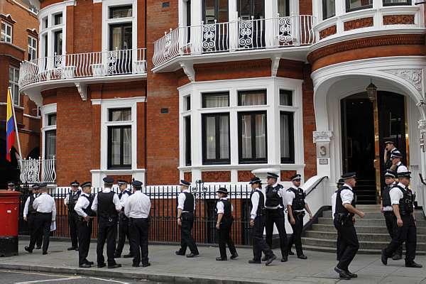 Por su parte, el ministerio de Relaciones Exteriores británico confirmó este sábado a la AFP que las partes comunes del edificio no están en territorio diplomático, por lo que en teoría podría ser detenido si se aventurara en ese espacio.