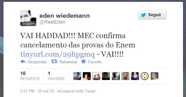 Às vésperas das eleições, quando o candidato tucano José Serra está atacando seu oponente Haddad, o perfil no facebook do jornal "O Globo" ajudou a espalhar um boato falso sobre cancelamento da prova do ENEM 2012, ressuscitando uma notícia antiga de 2009 como se fosse atual.