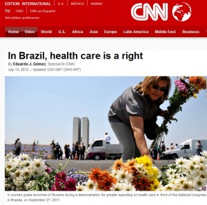Luglio 17, 2012 21:00 - no comments yetEm meio às discussões da reforma do Sistema de Saúde dos Estados Unidos, o portal do canal a cabo de notícias norte-americano CNN divulgou um artigo elogiando o Sistema Único de Saúde (SUS). O autor do texto, Eduardo Gómez, ressalta que, desde o início do século XX, o governo brasileiro e a sociedade civil têm trabalhado juntos para estabelecer a saúde como um bem comum, ao compartilhar o ônus de pagar pelos serviços por meio de impostos.