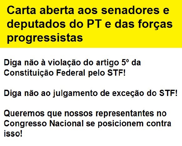 октября 10, 2012 21:00 - no comments yetCaros deputados e senadores,O atual silêncio da bancada petista nos incomoda. Vocês receberam milhões de votos de cidadãos e trabalhadores de todo o Brasil e devem sim honrar seus mandatos. Nós, cidadãos e eleitores do PT, estamos fartos de sermos chamados de desonestos, eleitores de “petralhas”, eleitores de bandidos, bandidos eleitores, achincalhados pelos grandes meios de comunicação (a atual ministra da Cultura e senadora por São Paulo, Marta Suplicy, eleita com milhões de votos de eleitores de São Paulo, escreve coluna periódica no jornal que mais nos achincalha, mais nos estigmatiza politicamente, a Folha de S.Paulo, e isso é algo inconcebível). Tomem tenência!Nós eleitores de vocês, deputados federais e senadores, queremos resposta imediata e sem delongas a este massacre midiático em que se converteu o julgamento da Ação Penal 470 no STF. Queremos pronunciamentos no Congresso já! Queremos declarações públicas de que este julgamento no STF é um julgamento de exceção, pois não somos eleitores leitores de Vejas da vida e nem dos jornalões. Sabemos o que se passa neste julgamento e por isso somos conscientes ao rotulá-lo como de exceção.Por isso, como eleitores atentos, queremos já a manifestação dos senhores eleitos com nossos votos. Não é possível tamanho e constrangedor silêncio dos senhores deputados e senadores diante do que está ocorrendo neste país. Não é aceitável este silêncio que nos causa vergonha diante das absurdas condenações, posto que extravagantes, esdrúxulas e ao arrepio da Constituição Federal e dos direitos elementares dos cidadãos que estão sendo proferidas no STF. Estamos vivenciando um tribunal de exceção em plena democracia e isso exige dos outros poderes, os senhores, que se manifestem.Provas estão sendo negligenciadas em prol de ilações e conjecturas. O ônus da prova da acusação, princípio basilar dos Direitos Fundamentais do Homem, perdeu-se no vendaval de absurdos que estamos assistindo, dia após dia, e os senhores se mantêm em silêncio obsequioso, sendo portadores do mais legítimo poder em uma democracia.Nós, cidadãos do Brasil, trabalhadores, abundantemente abastecidos por informações que nos permitem entender claramente o que está acontecendo e eleitores dos senhores, exigimos que se manifestem imediatamente.Sabemos que a Constituição Federal em seu artigo 5º inciso XXXVII preconiza de forma taxativa que não haverá juízo ou tribunal de exceção nesta República. Pois bem, estamos vivenciando este fundamental preceito constitucional violado pelo STF em nome das pressões da mídia monopolizada do Brasil, na qual o governo federal despeja rios de dinheiro. Trata-se de um julgamento venal, de exceção e que atinge o PT em suas origens e nós não aceitaremos isso. Estamos colocando em xeque a credibilidade do STF sim!Por isso exigimos que vocês, nossos representantes, não se omitam nesta quadratura política e de tensionamento. Nós, cidadãos e eleitores de vocês, por isso, exigimos que honrem seus mandatos, em nome do que resta de democracia neste país.Este movimento está apenas começando. Sabemos que responderão as nossas expectativas. Aguardaremos suas manifestações em plenário, nos blogs onde há livre manifestação de pensamentos e opiniões e em todos os espaços que julgarem fundamentais de modo a honrar os votos e a esperança das quais são depositários.O que jamais aceitaremos é a omissão!Jamais!Nós, cidadãos, hoje sabemos que somos o real poder neste país.
