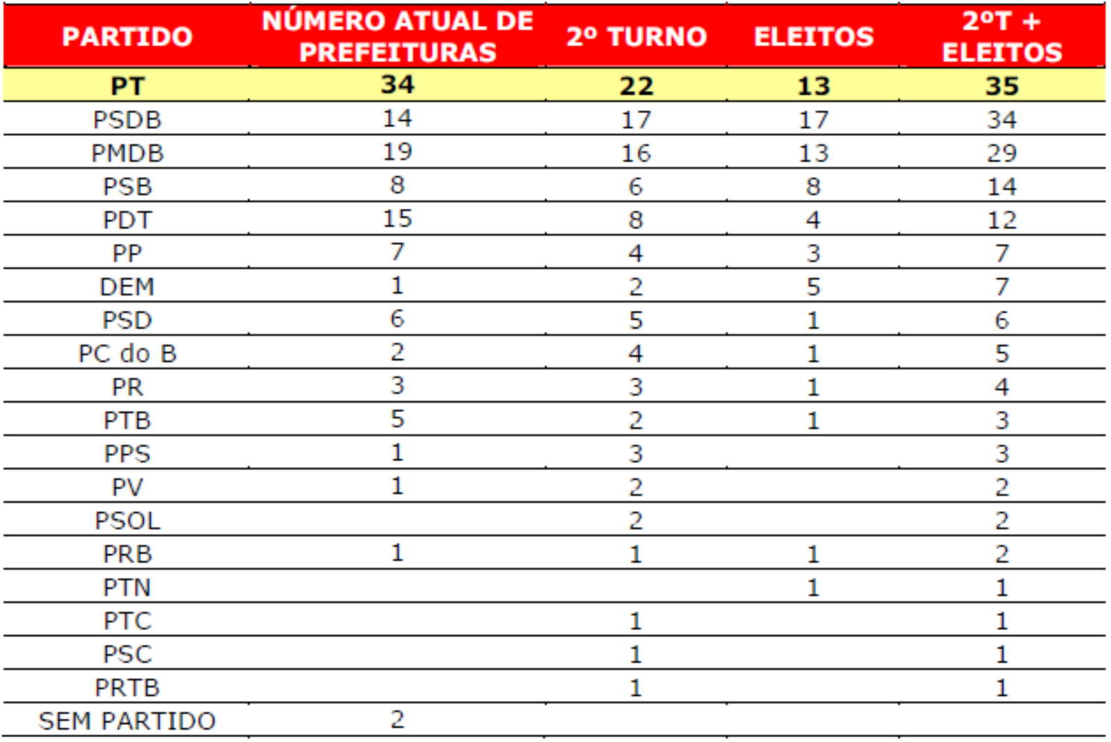Entre os grandes partidos apenas o PT e o PSB conseguem melhorar o desempenho de 2008. O PSD já aparece como o quarto partido em número de prefeituras.