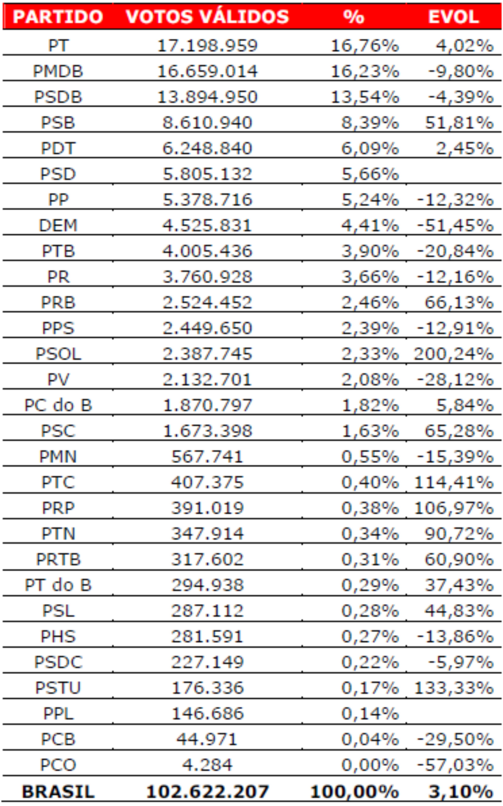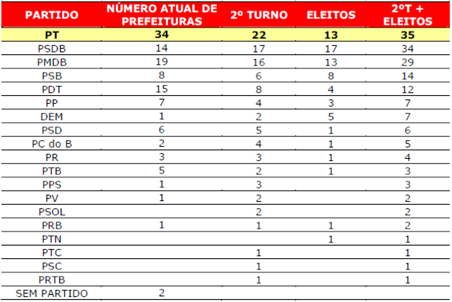 PT recebe 17.198.959 votos para prefeito. A melhor votação de um partido nas eleições de 2012.