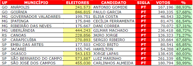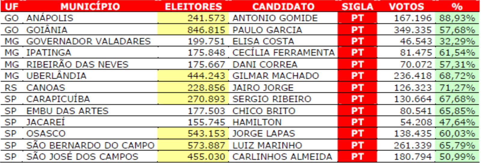 Entre os 13 prefeitos já eleitos pelo PT, 5 estão em municípios com menos de 200 mil eleitores e 8 prefeitos foram eleitos sem a necessidade de realização de um segundo turno da eleição.