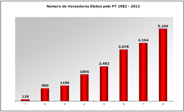 O PT também mantém o crescimento constante no número de vereadores eleitos. Aumentou em 24% o número de vereadores e vereadoras petistas.