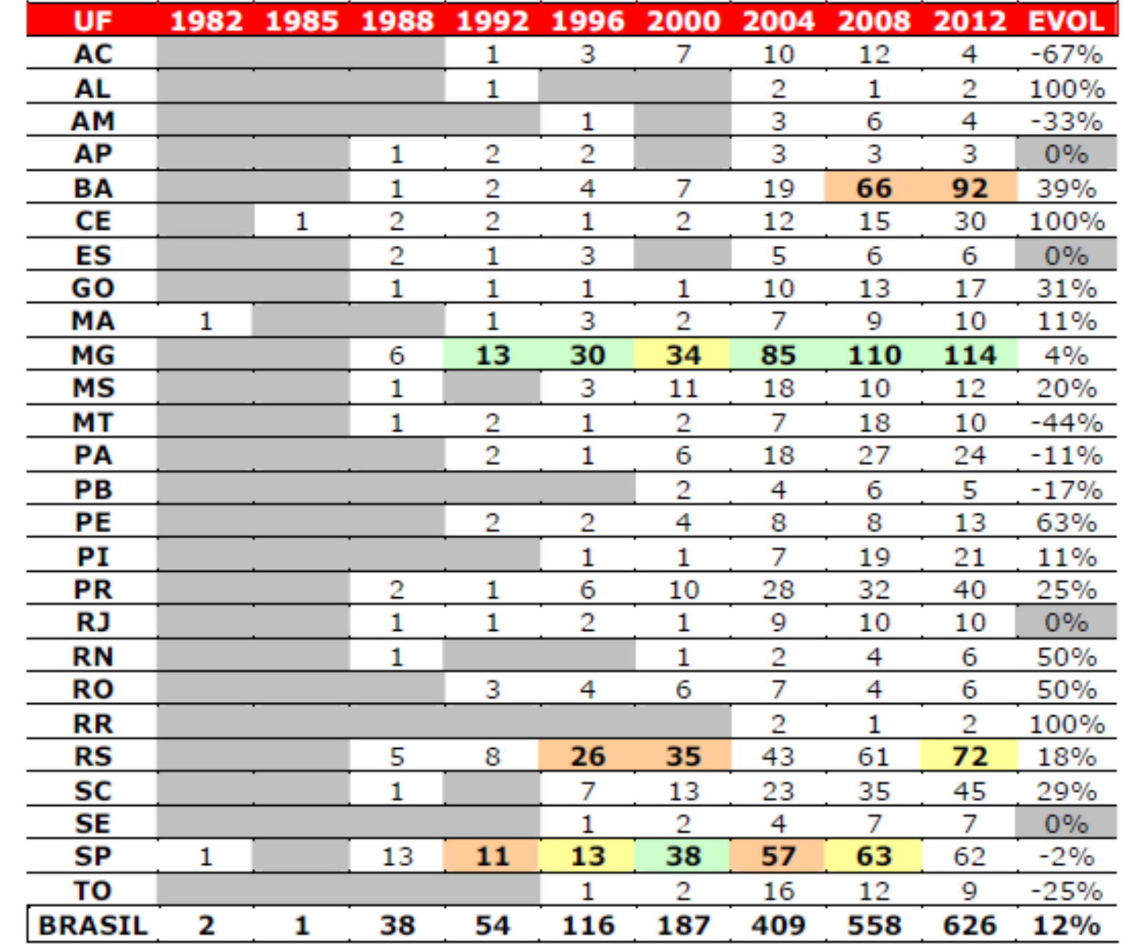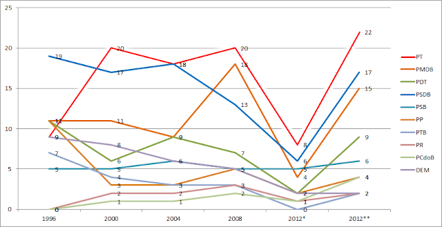 | 2012* = 1º Turno; 2012** = Em disputa no 2º Turno |