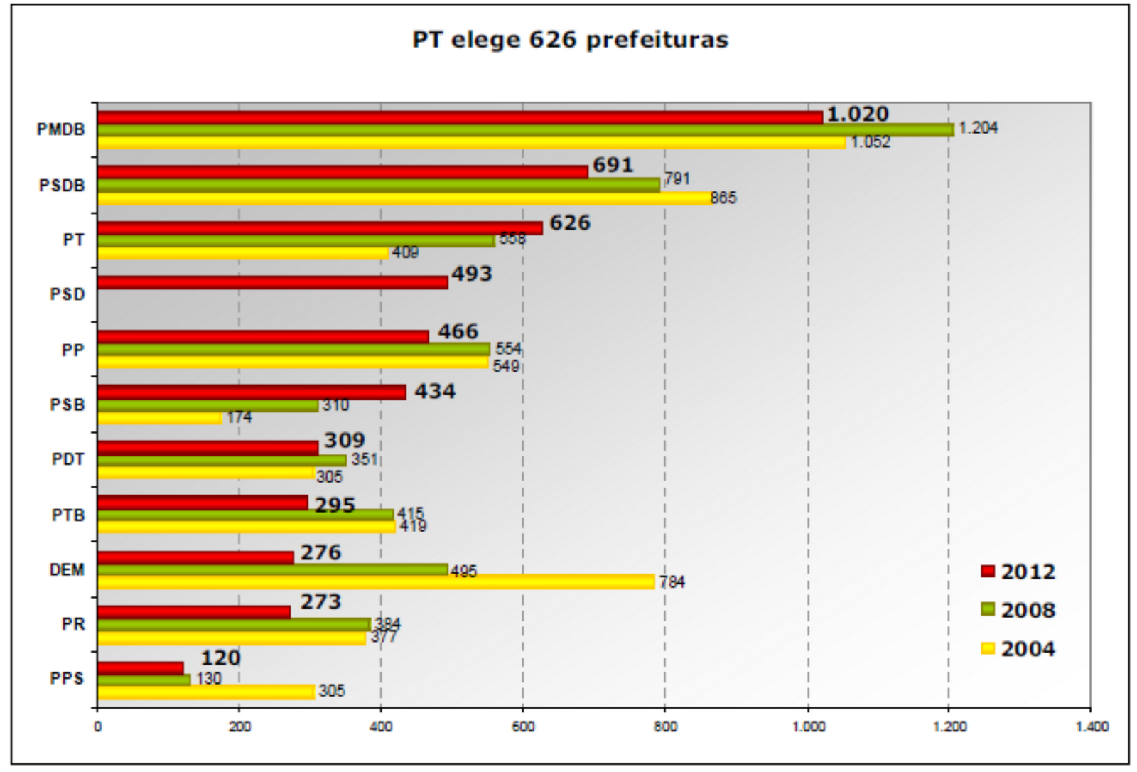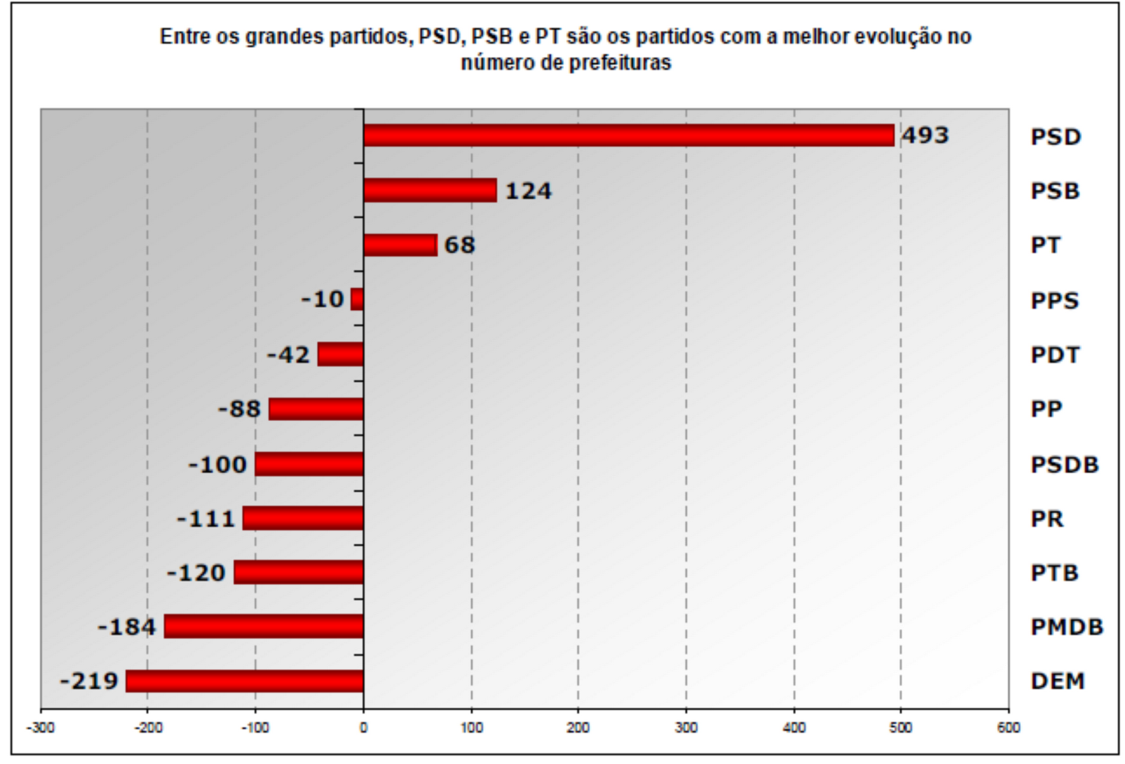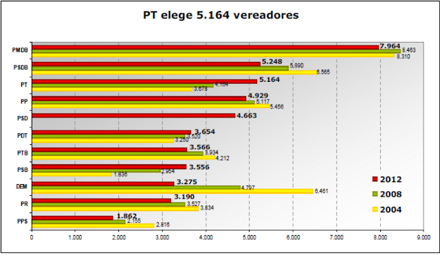 Em relação a 2008, o DEM perdeu 219 prefeituras e o PMDB 184 prefeituras. O PT e o PSB elegeram, respectivamente, 68 e 124 prefeitos a mais em 2012.