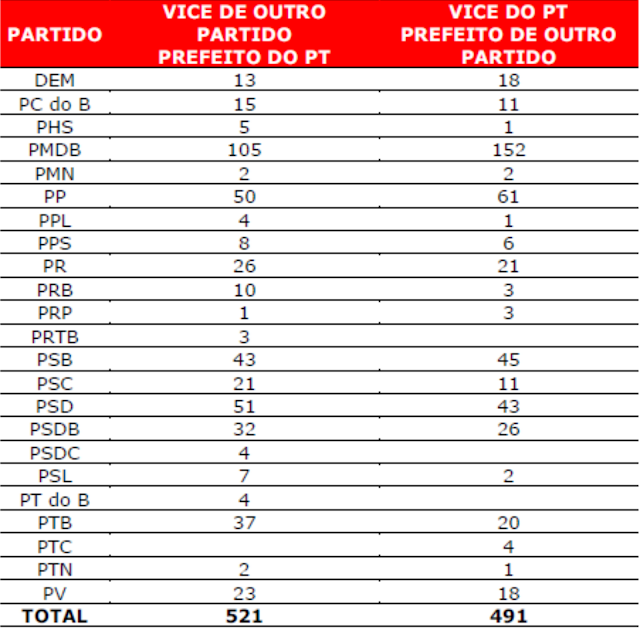 O PT elegeu 596 vices-prefeitos. Em 105 municípios o PT venceu a eleição com chapa pura e em outros 491 municípios um vice do PT governará junto com um prefeito de outro partido. Os 626 prefeitos e prefeitas do PT possuem vices de outros partidos.