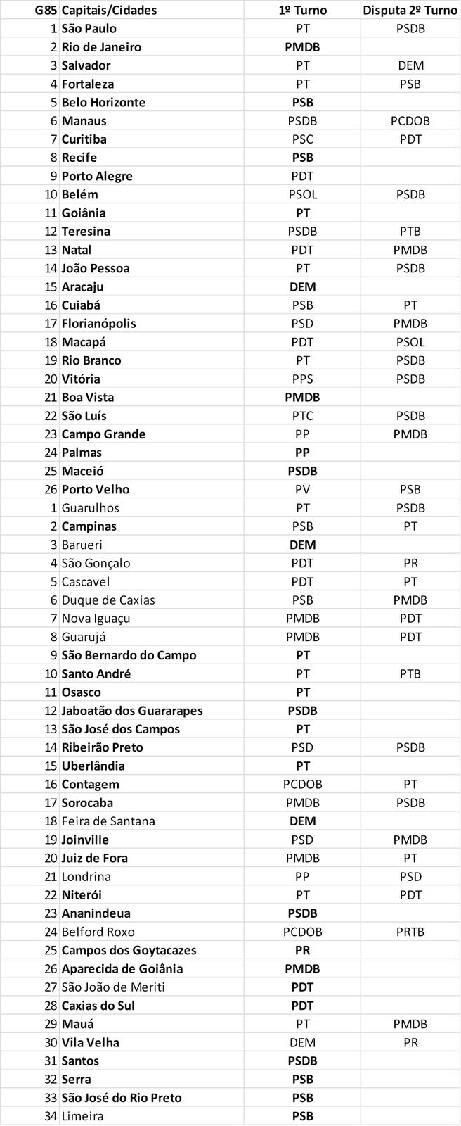 14 de Outubro de 2012, 21:00 - sem comentários aindaO G85 é o Grupo composto por 26 capitais e 59 cidades com mais de 200 mil eleitores.