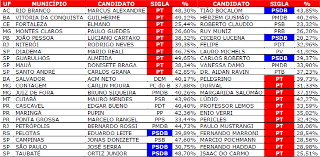Em relação a 2008, o PT aumentou em 12% o número de prefeituras. Há ainda, outros 22 candidatos que irão disputar o segundo turno.