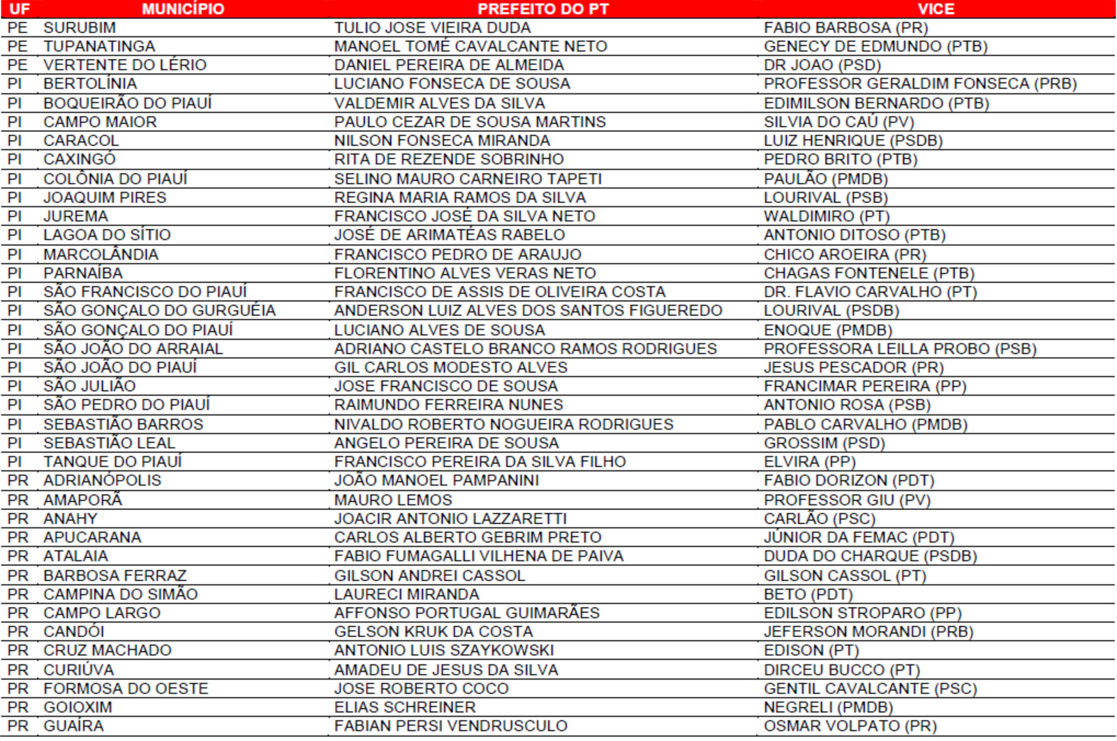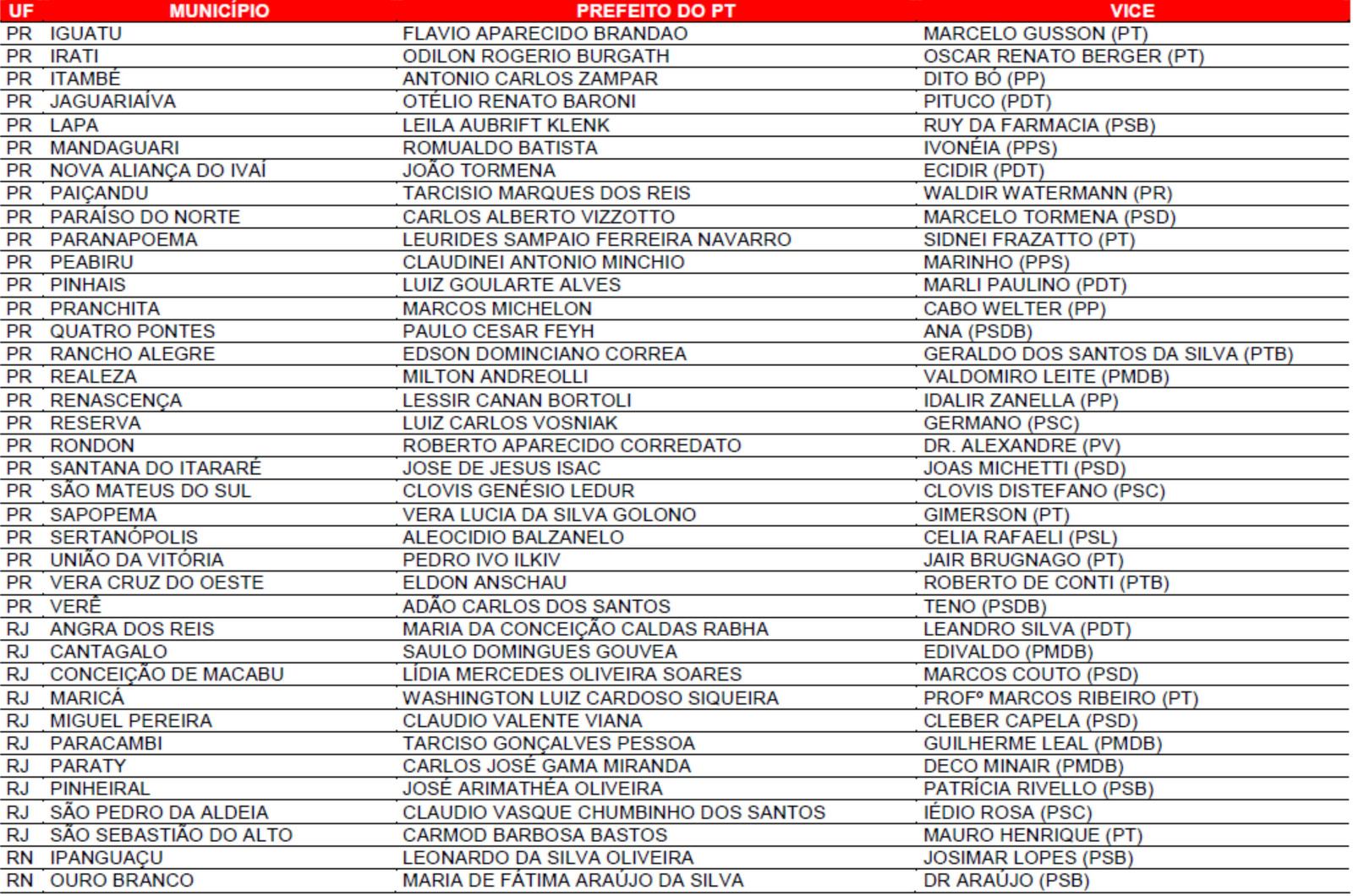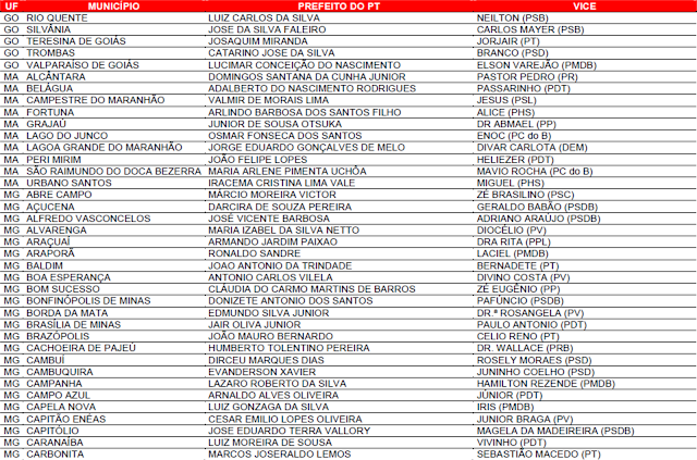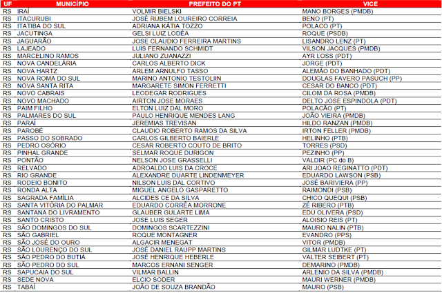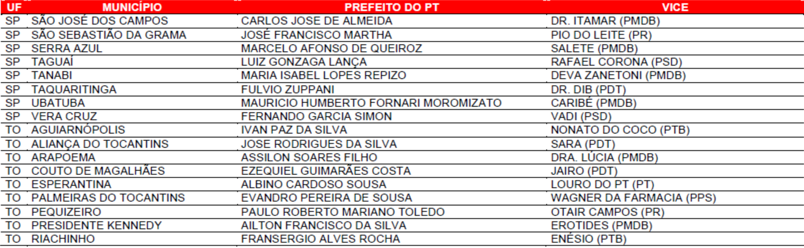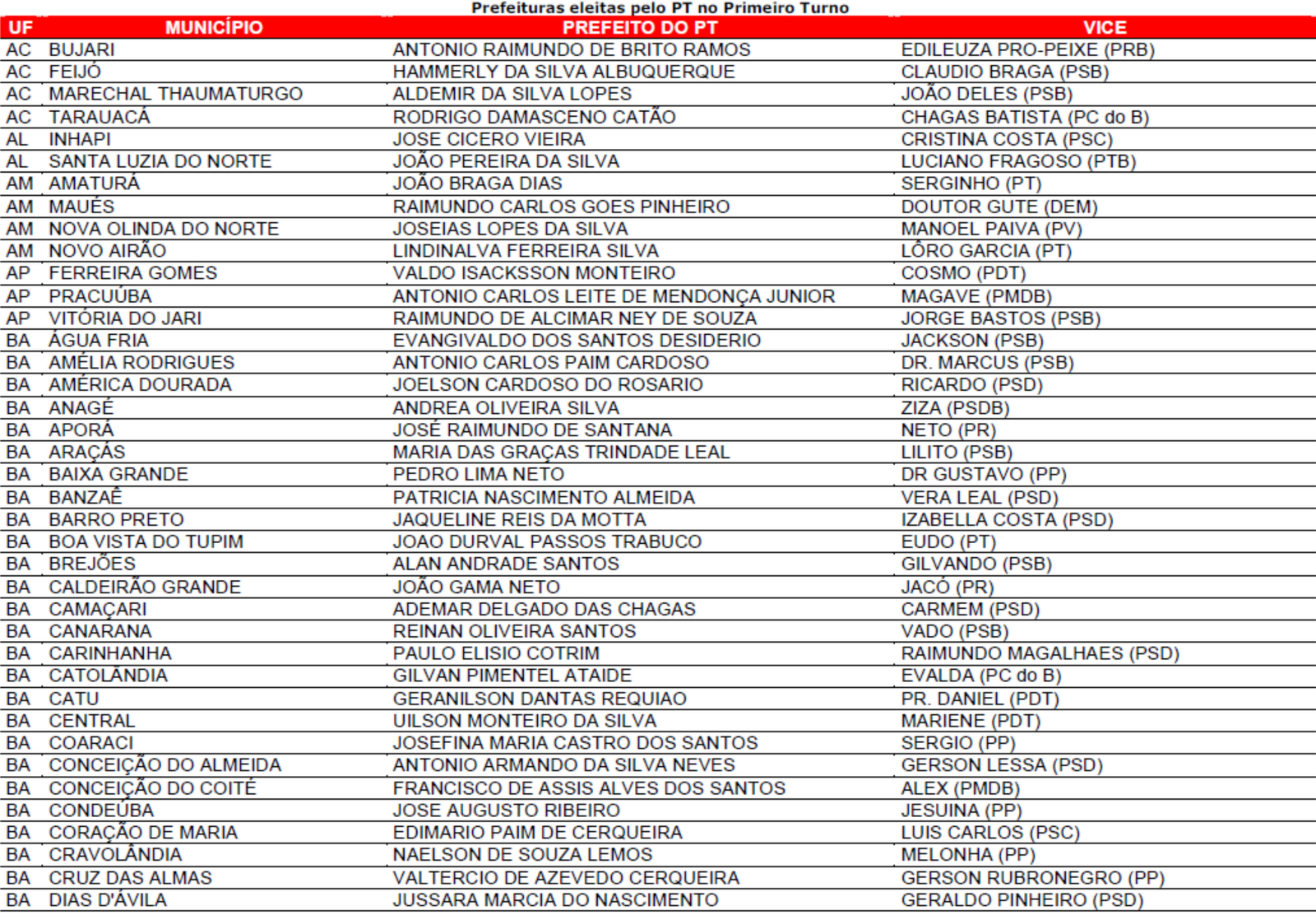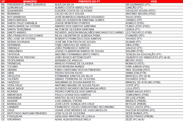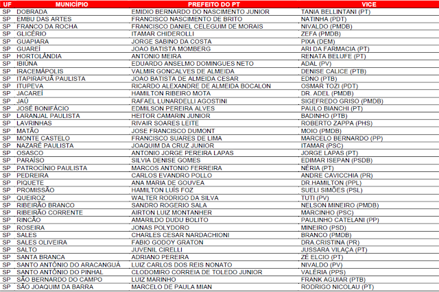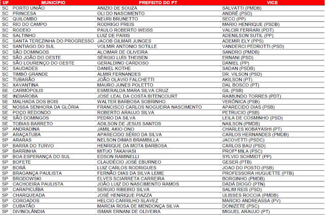 Prefeituras conquistadas pelo PT no primeiro turno