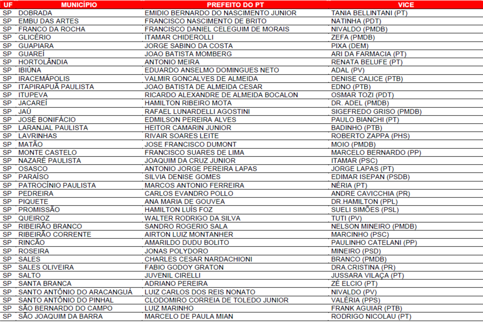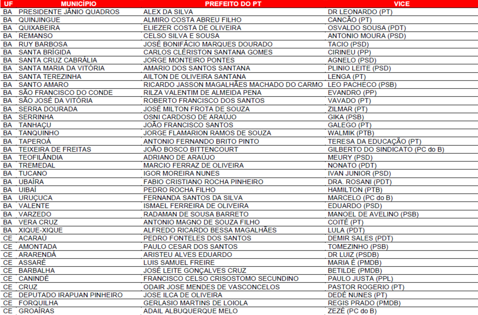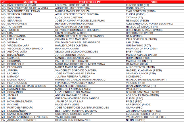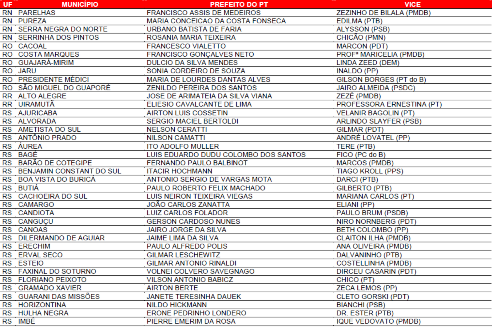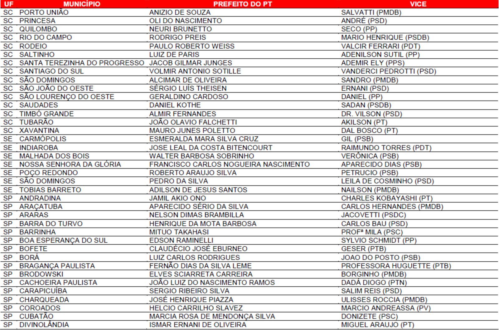 Prefeituras conquistadas pelo PT no primeiro turno