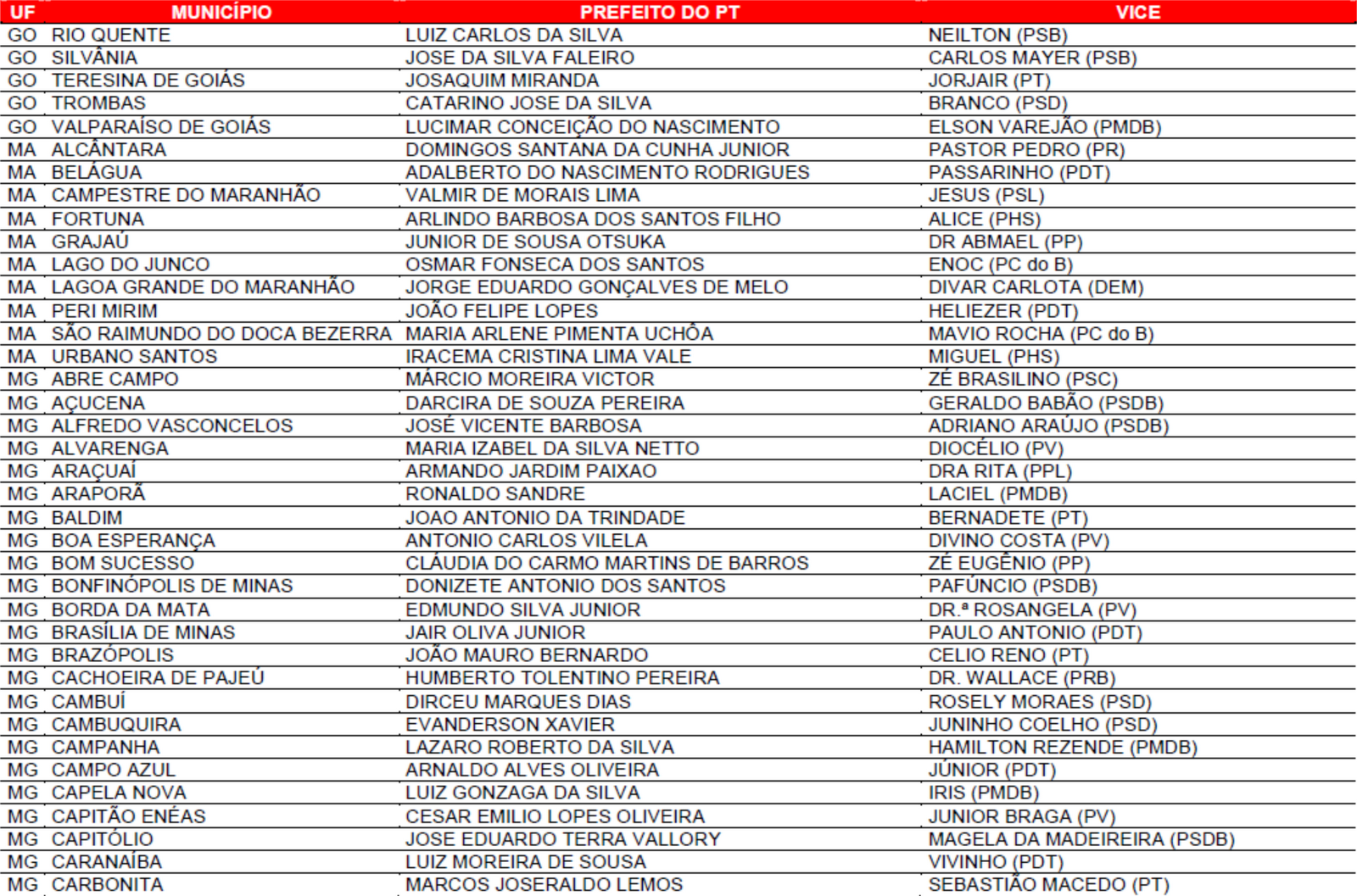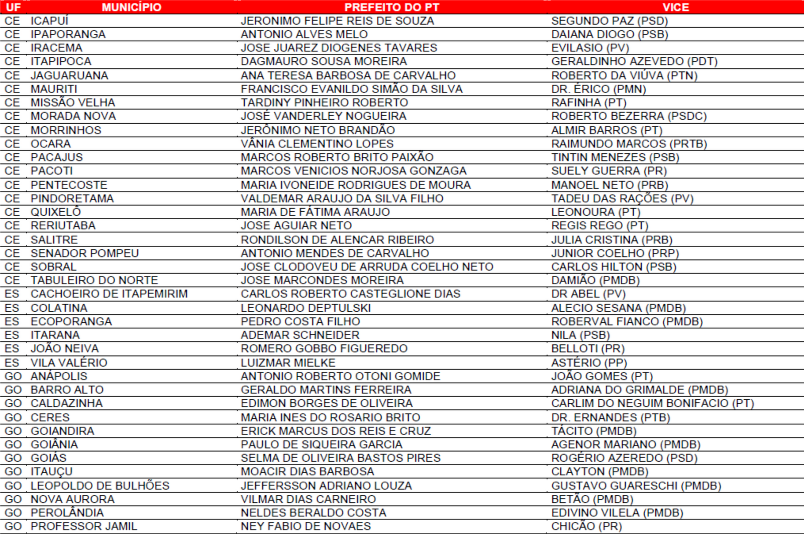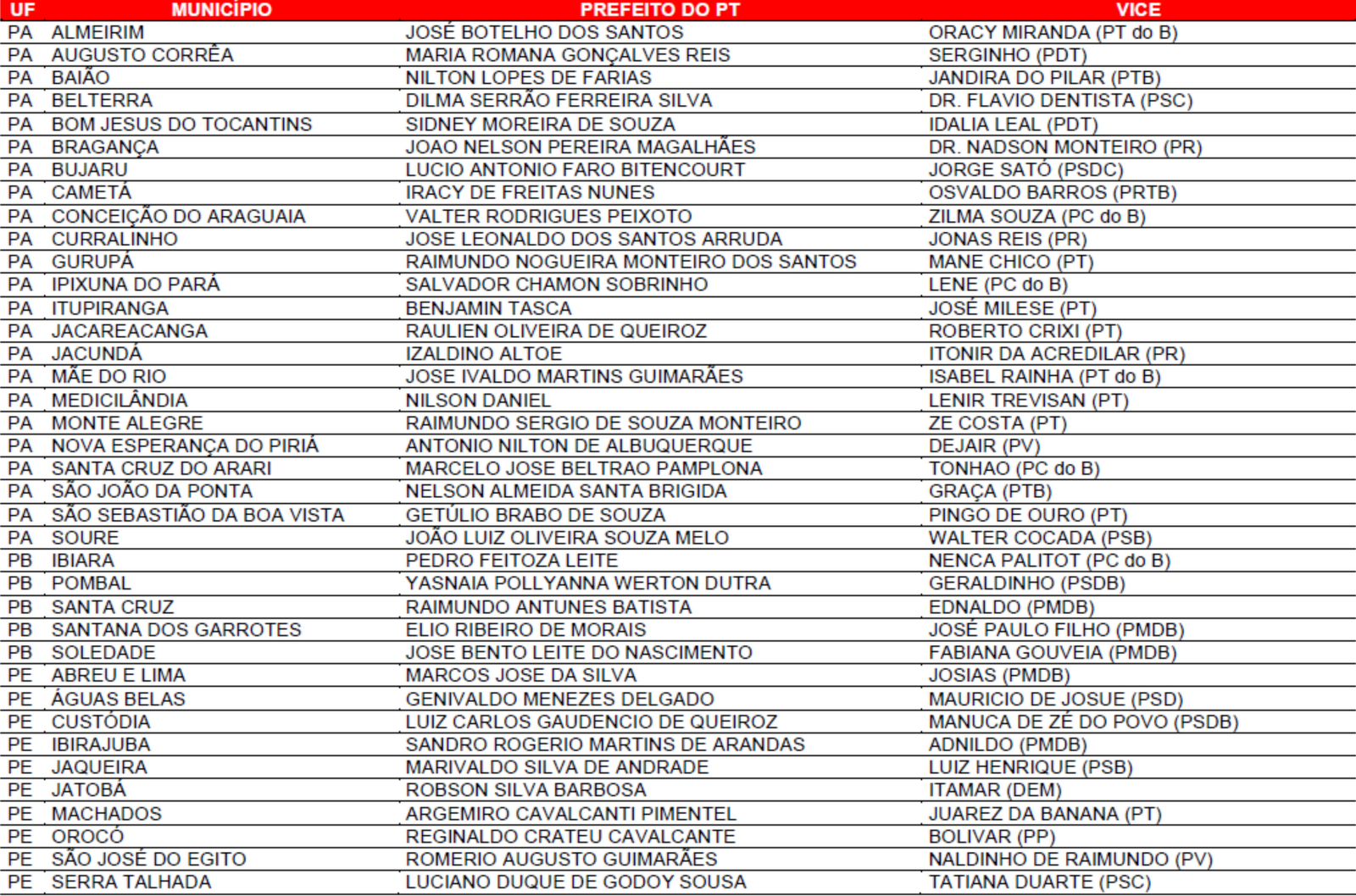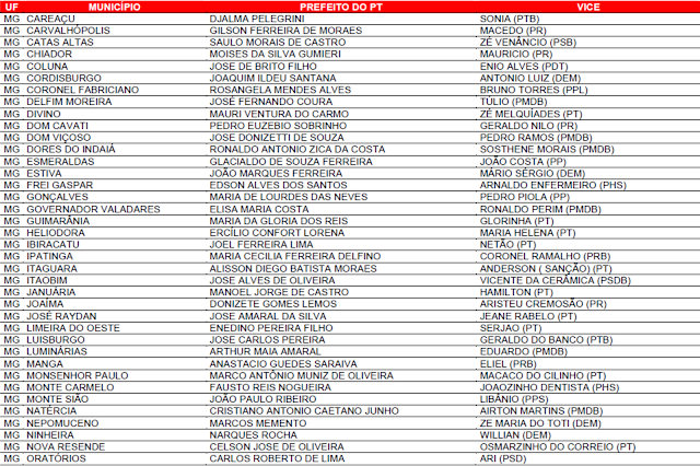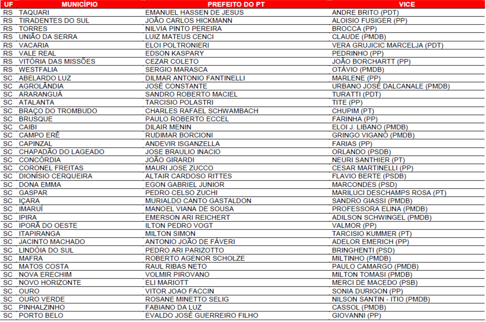 Prefeituras conquistadas pelo PT no primeiro turno
