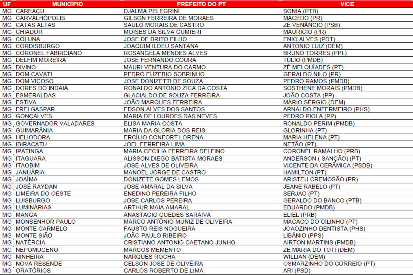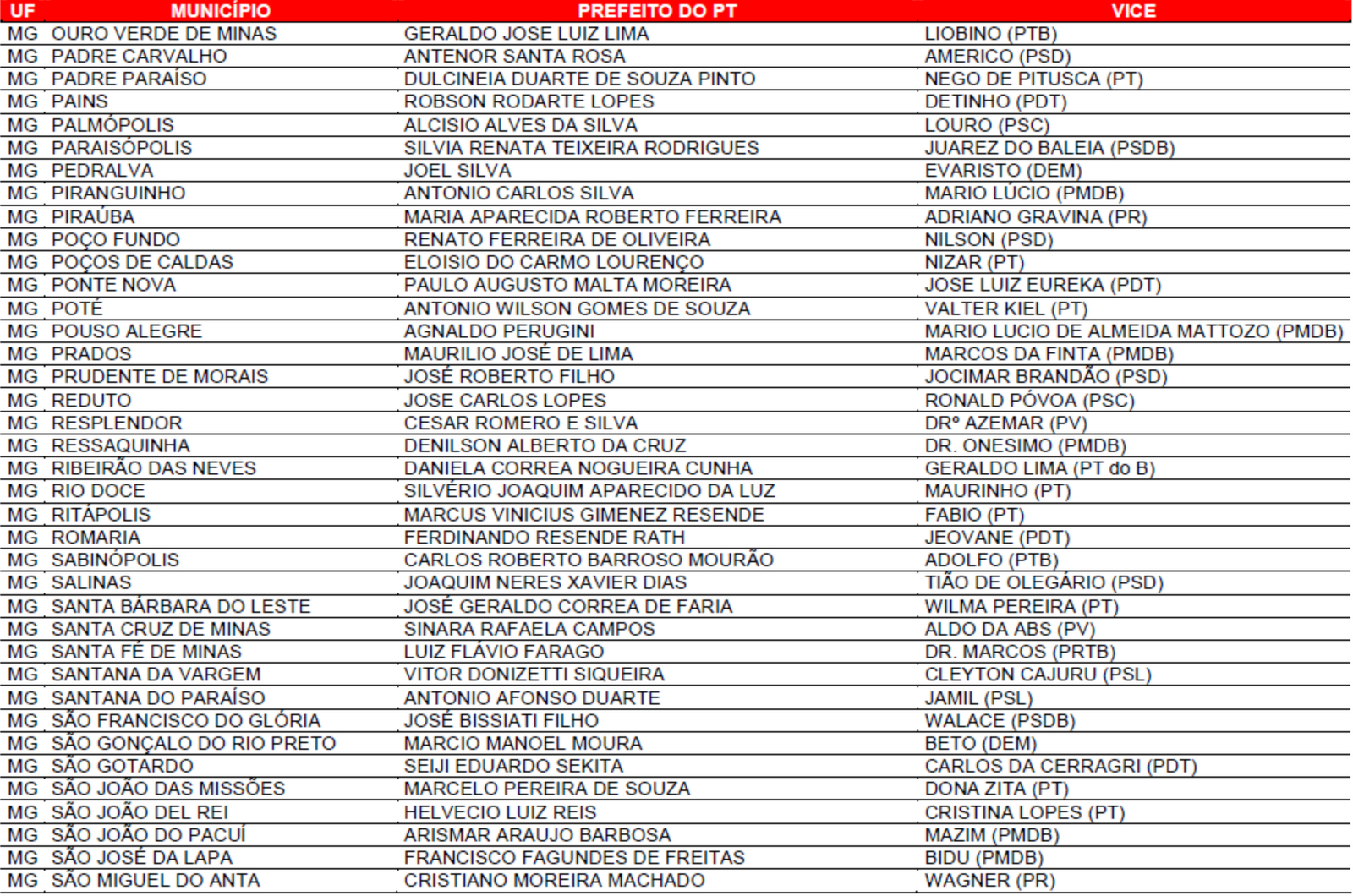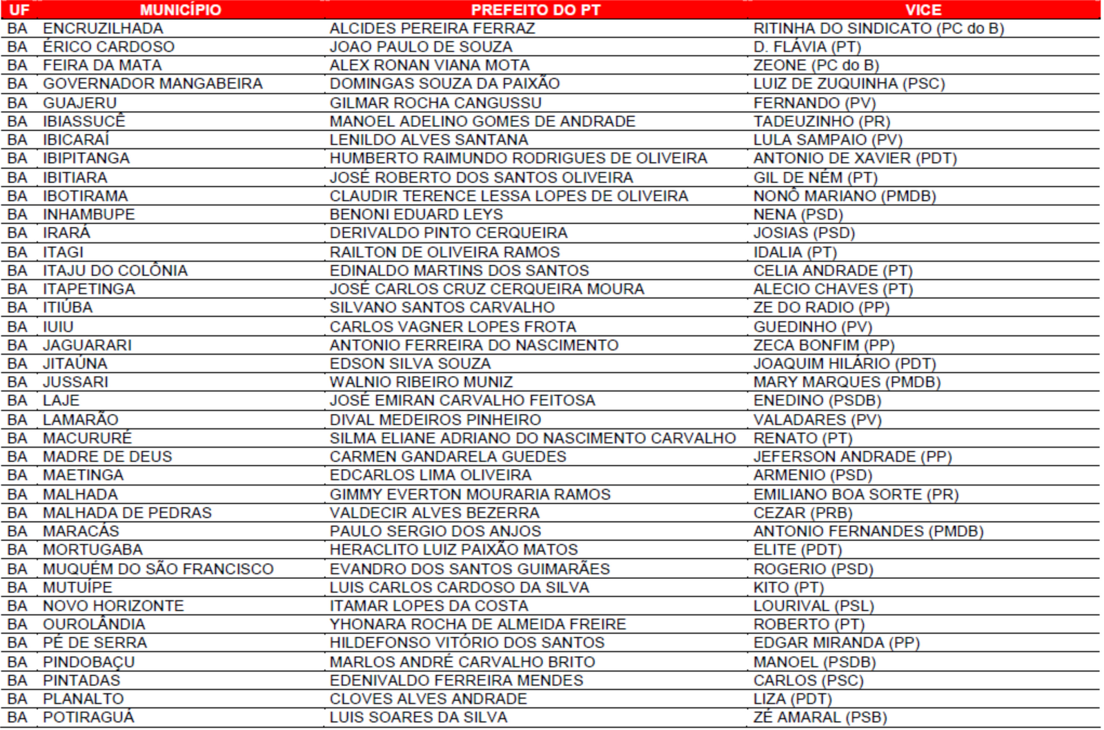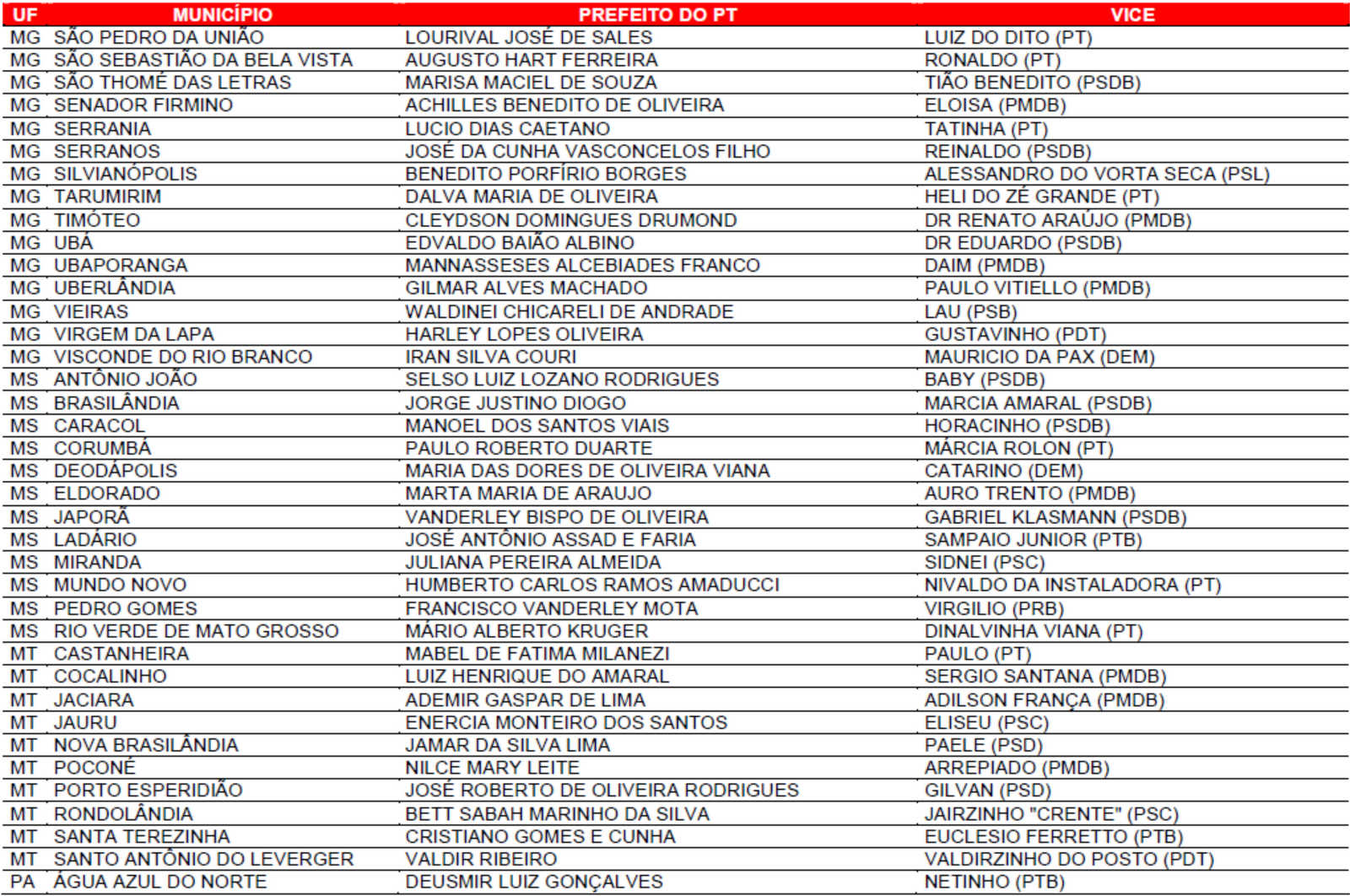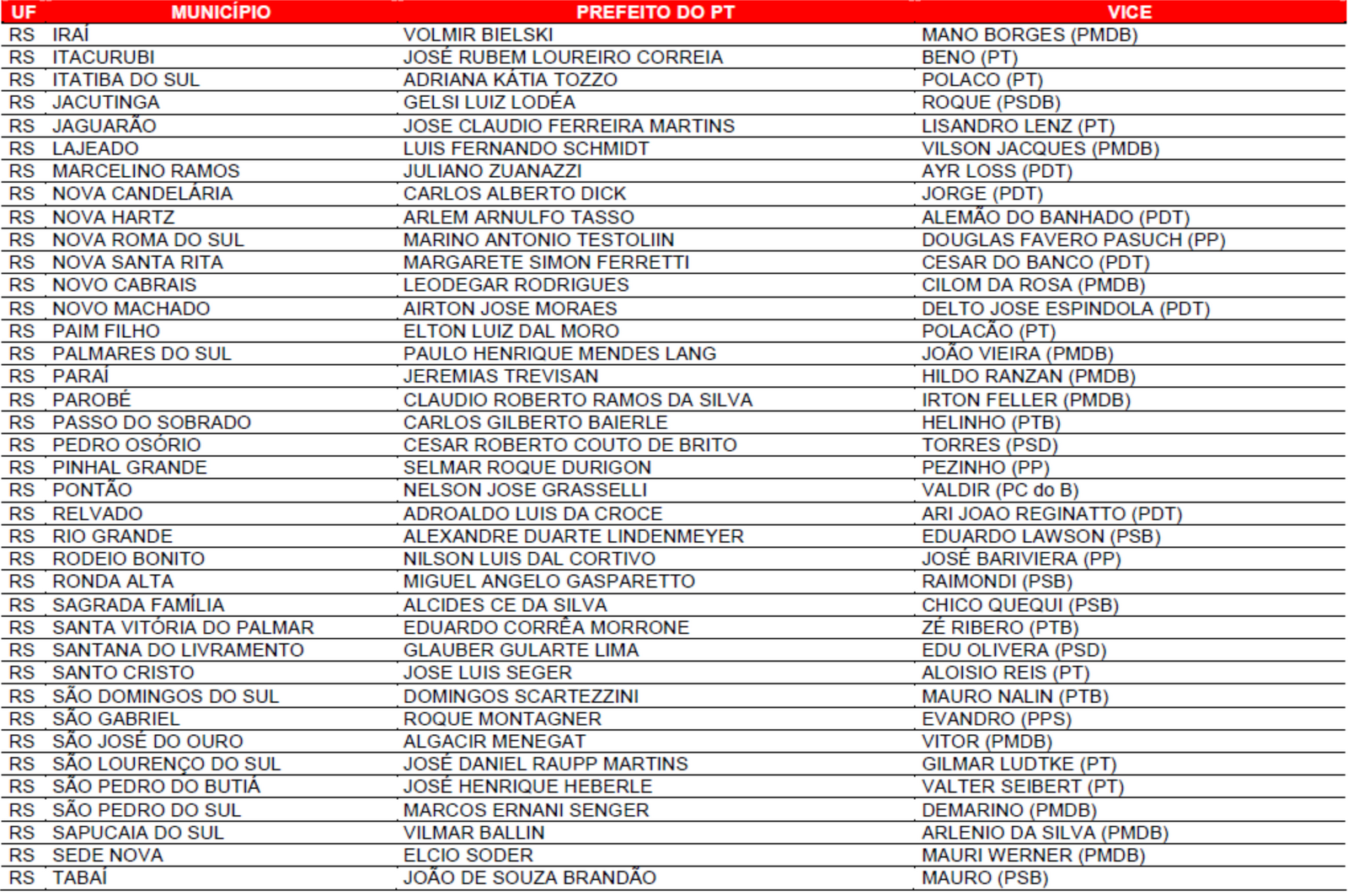 Prefeituras conquistadas pelo PT no primeiro turno