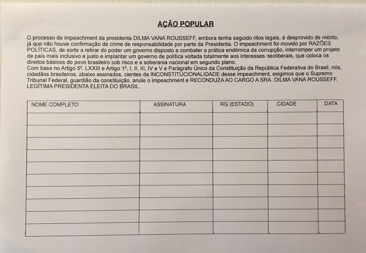 Estamos em um processo ativo de coleta de assinaturas para a AÇÃO POPULAR PELA ANULAÇÃO DO IMPEACHMENT. O impeachment da presidenta Dilma é anulável via Supremo Tribunal Federal. No entanto, não o farão se não houver pressão popular. Essa Ação tem como objetivo formalizar essa pressão junto ao STF para que anulem a farsa e reconduzam Dilma ao cargo que lhe foi usurpado. Acreditamos que o seu retorno restabelecerá a democracia e o equilibro jurídico e institucional, tão necessários para que tenhamos novas eleições confiáveis e respeitadas.