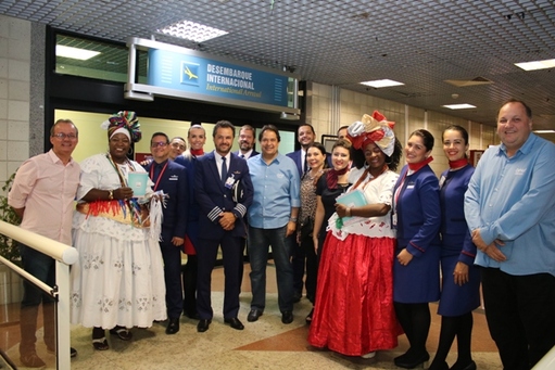 Os passageiros do voo 8179 foram recebidos, no desembarque internacional, por baianas tipicamente vestidas, que saudaram os visitantes com a tradicional hospitalidade, folheteria e fitinhas do Bonfim.