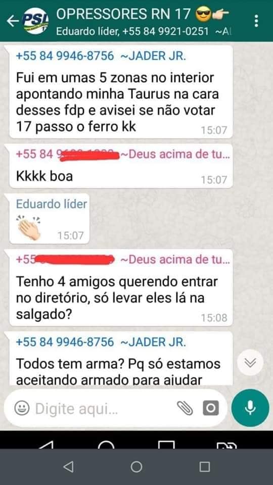O Jader é o mais exaltado nas conversas, chega a perguntar se “todos têm arma?”. E diz que só estão aceitando pessoas do grupo que possam estar armadas para ajudarem no esquema. Qual o esquema? “Tocar o terror no ptralhas”.