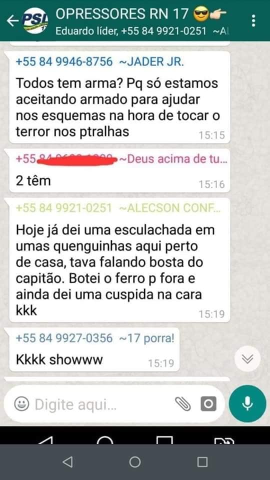 Em uma das mensagens, o contato “ALECSON”, afirma que na noite anterior, tudo teria saído “como planejado”. Ele teria feito “uns comuna se mijarem” e termina sorrindo. Já “JADER” se gaba ao afirmar que esteve em umas “5 zonas” (cabaré), e apontado uma arma na cara das pessoas para as intimidar. Ele ainda diz em outra mensagem que em caso de vitória do seu candidato, Bolsonaro, “vou botar na vala uns 4 com certeza já tá marcado”. As pessoas marcadas para morrer morariam perto da residência do mesmo.