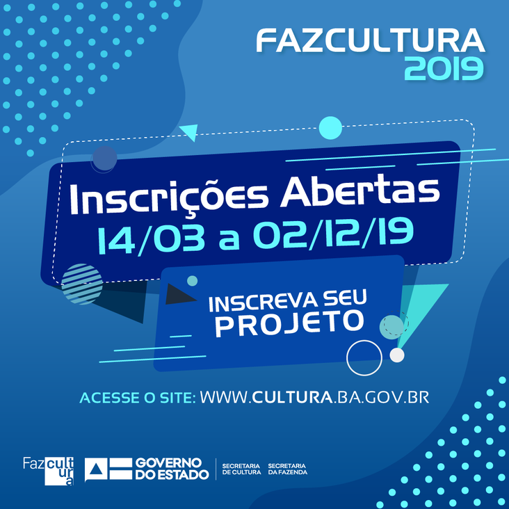 O Governo da Bahia assegurou para o Fazcultura, em 2019, 15 milhões de reais. A legislação do programa autoriza propostas de qualquer segmento cultural, podendo se inscrever pessoas físicas ou jurídicas, sediadas no estado da Bahia.