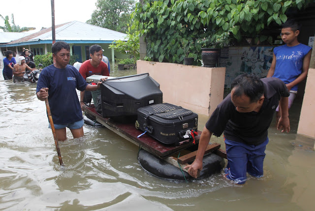 | Moradores carregam pertences com jangada improvisada depois da enchente de Bengkulu, na Indonésia. |